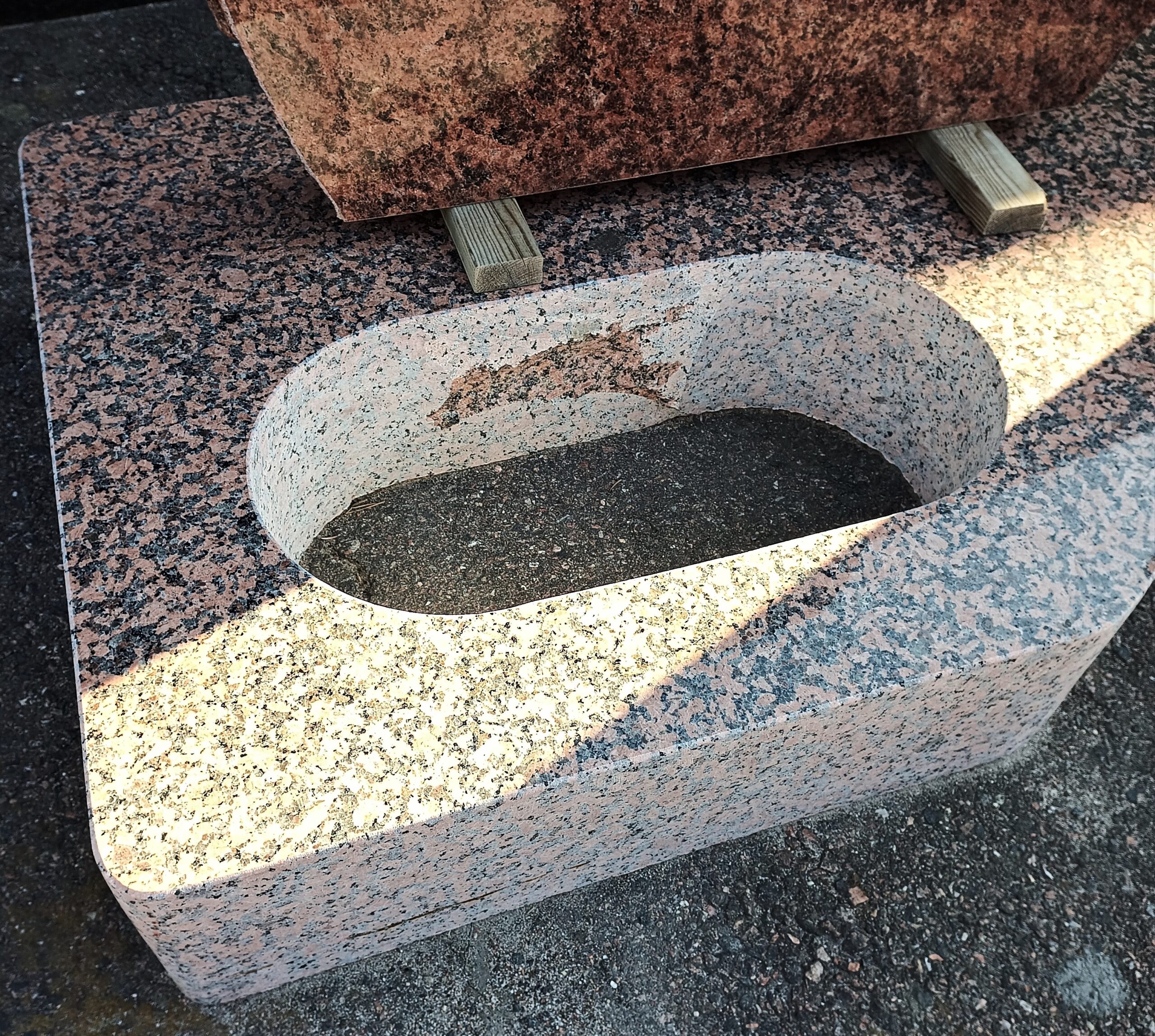 Taivassalon punaisesta kivestä erikoismuotoiltu reikäpohja esim. 70-90cm kokoiselle hautakivelle. Reikäpohjan kanssa pystytään tuomaan lisää kantavuutta kivelle ja vähentämään muistomerkin kaatumisherkkyyttä.
